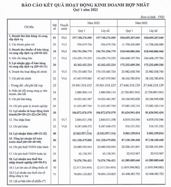 Tính riêng 3 tháng đầu năm 2023, DIC Corp ghi nhận doanh thu thuần đạt 196,79 tỷ đồng, giảm 62,1% so với cùng kỳ. Doanh thu từ bất động sản đạt hơn 72 tỷ đồng, giảm mạnh so với mức 363 tỷ đồng so với cùng kỳ. Sau khi trừ các loại chi phí và thuế, DIG báo lãi trước thuế 101,3 tỷ đồng, tăng 16,3% so với cùng kỳ và lãi sau thuế đạt 76,5 tỷ đồng, tăng 24% so với cùng kỳ năm trước.