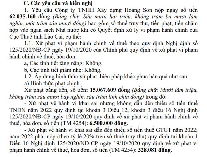 Với những vi phạm nêu trên, Cục Thuế tỉnh Lào Cai yêu cầu Công ty TNHH Xây dựng Hoàng Sơn nộp ngay số tiền hơn 62 triệu đồng bao gồm số thuế truy thu, tiền phạt, tiền chậm nộp vào ngân sách Nhà nước khi có quyết định xử lý vi phạm hành chính của Cục Thuế tỉnh Lào Cai.
