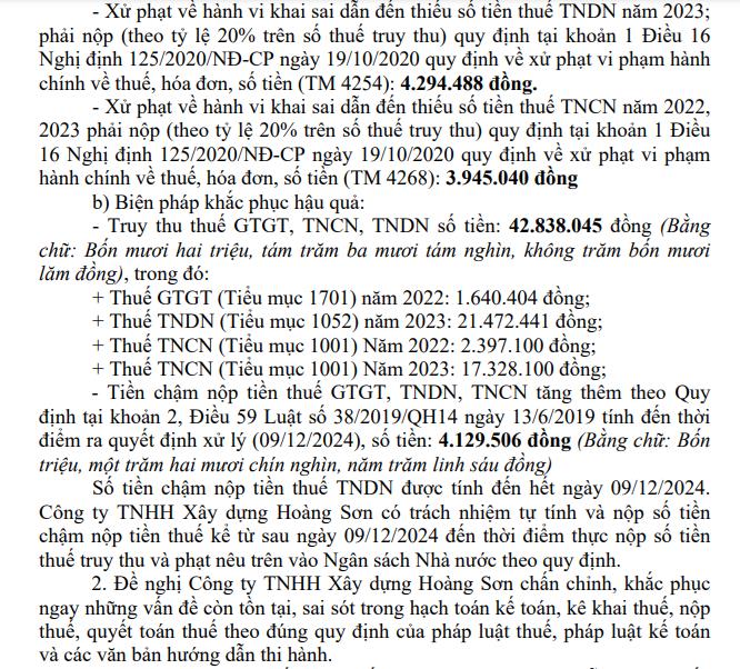 Số tiền chậm nộp tiền thuế thu nhập doanh nghiệp được tính đến hết ngày 9/12/2024. Công ty TNHH Xây dựng Hoàng Sơn có trách nhiệm tự tính và nộp số tiền chậm nộp tiền thuế kể từ sau ngày 9/12/2024 đến thời điểm thực nộp số tiền thuế truy thu và phạt nêu trên vào Ngân sách Nhà nước theo quy định.