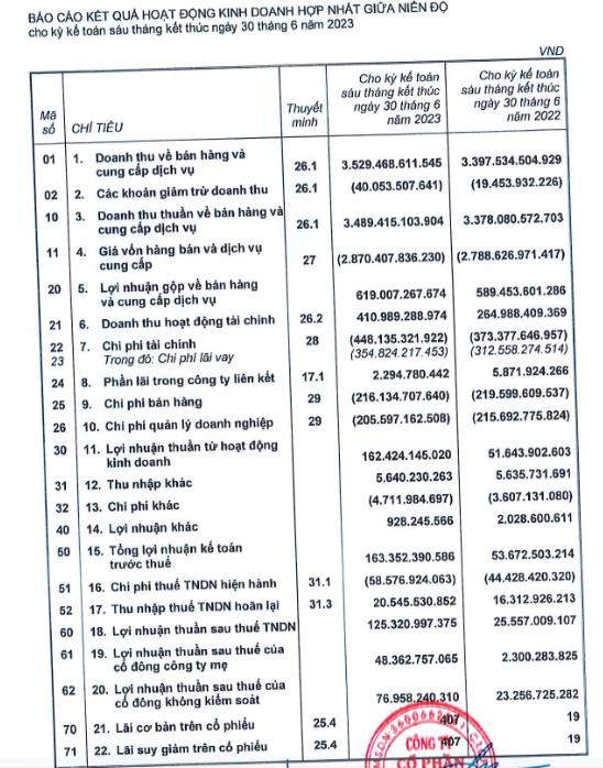Về bức tranh tài chính, theo báo cáo kinh doanh hợp nhất giữa niên độ 2023, DNP Holding ghi nhận doanh thu thuần đạt 3.489 tỷ đồng, tăng 3,2% so với cùng kỳ.
