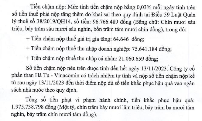 Ngoài ra, Than Hà Tu - Vinacomin phải nộp thêm 96,8 triệu đồng do chậm nộp tiền thuế.