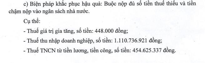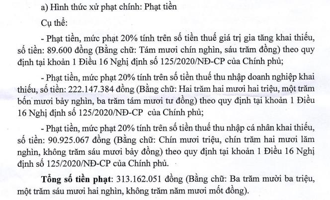 Theo quyết định đề cập, THT có hành vi khai sai dẫn đến thiếu số tiền thuế phải nộp, bao gồm thuế thu nhập doanh nghiệp, giá trị gia tăng và thuế thu nhập cá nhân.