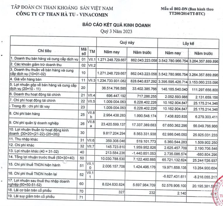 Về kết quả kinh doanh, quý III/2023, Than Hà Tu - Vinacomin ghi nhận doanh thu thuần đạt 1.271,2 tỷ đồng, tăng 47% so với cùng kỳ năm trước. Lợi nhuận sau thuế quý III đạt 8 tỷ đồng, tăng 40% so với cùng kỳ năm 2022.