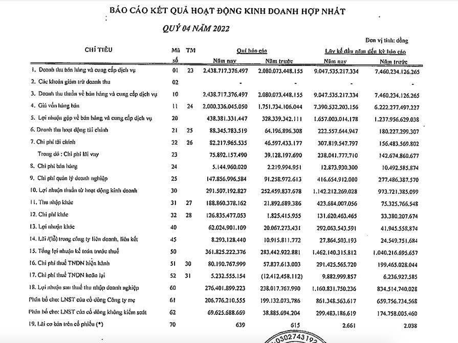 Lũy kế cả năm 2022, doanh thu thuần của PVTrans đạt 9.047 tỷ đồng và lợi nhuận sau thuế đạt 1.161 tỷ đồng.