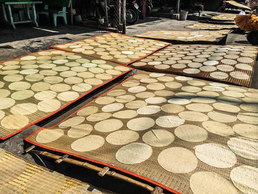 Sau đó ngâm đúng 3 ngày 3 đêm, đãi cho sạch nước đục đem đun sôi rồi bỏ vào cối quết, bột nhuyễn đem ra cán thành bánh, phơi nắng rồi đem nhúng nước đường và phơi lại lần nữa cho khô mới đóng gói. Các phụ gia như đậu, mè, sữa… được đưa lần lượt vào bánh theo từng công đoạn.
