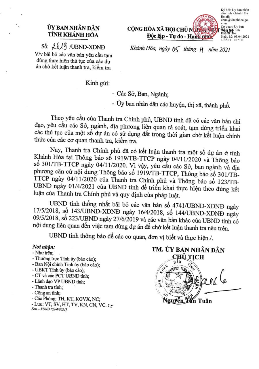 Trước đó, theo yêu cầu của Thanh tra Chính phủ, UBND tỉnh Khánh Hòa đã có các văn bản yêu cầu các sở, ngành, địa phương liên quan rà soát, tạm dừng triển khai các thủ tục của một số dự án có sử dụng đất trong thời gian chờ kết luận chính thức của các cơ quan thanh tra, kiểm tra.
