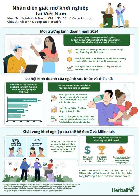 Herbalife, một trong những công ty và cộng đồng hàng đầu về sức khỏe và thể chất, hôm nay đã công bố những kết quả của Khảo Sát Ngành Kinh Doanh Chăm Sóc Sức Khỏe tại khu vực Châu Á Thái Bình Dương. Kết quả cho thấy rằng mặc dù có những lo ngại về tình trạng hiện tại của nền kinh tế, có hơn ba trên năm (69%) người có mong muốn khởi nghiệp ở Việt Nam có kế hoạch bắt đầu công việc kinh doanh nhỏ trong 18 tháng tới. Ngoài ra, còn có tinh thần lạc quan về khởi nghiệp khi có 74% người Việt tham gia khảo sát bày tỏ sự lạc quan về việc theo đuổi công việc kinh doanh trong những tháng tới.