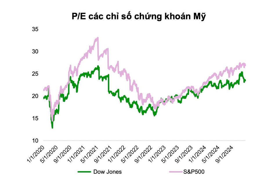 Trong năm 2024, dòng vốn đầu tư toàn cầu có xu hướng đổ về Mỹ một cách rõ nét. Các chỉ số chứng khoán Mỹ như Dowjones, S&P500 đều tăng mạnh và lập đỉnh mới trong năm 2024 với động lực từ nhóm công nghệ. Định giá của các chỉ số chứng khoán Mỹ cũng liên tục tăng cao và hiện đang ở quanh vùng cao nhất lịch sử.