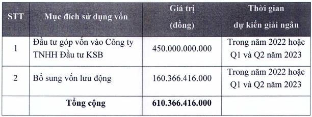 Với hơn 610 tỷ đồng dự kiến thu về, KSB sẽ dùng 450 tỷ đồng để đầu tư góp vốn vào Công ty TNHH Đầu tư KSB và hơn 160 tỷ đồng bổ sung vốn lưu động của Công ty.
