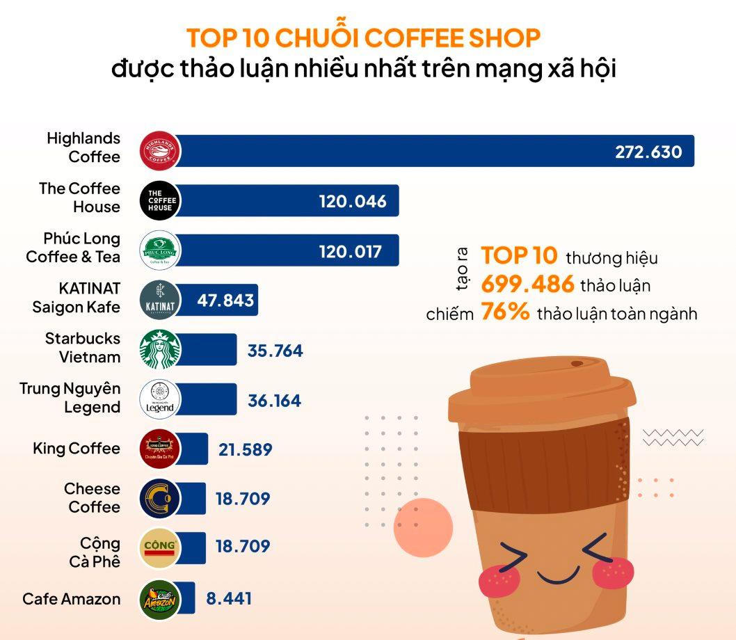 Dẫn đầu cách biệt với 272.620 thảo luận, chiếm gần 39% thị phần top 10 là Highlands Coffee . Kết quả này dường như không có gì đáng ngạc nhiên với độ bao phủ rộng khắp của thương hiệu.