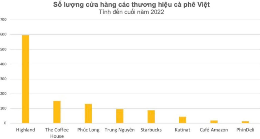 Báo cáo từ Euromonitor cho thấy, cuối năm 2022, thị trường chuỗi cà phê Việt Nam có quy mô khoảng 1 tỷ USD/năm. Còn theo tống kê bởi Q&Me, tính đến tháng 3/2023, số lượng cửa hàng của 14 thương hiệu chuỗi cà phê nổi bật nhất Việt Nam đã tăng thêm 133, đạt mốc 1.657 cửa hàng trên toàn quốc so với năm 2022.