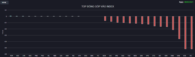 Nhà đầu tư có thể dễ dàng chỉ ra những gánh nặng đè lên chỉ số như VHM, VNM, GVR, BID, CTG, HPG,... trong khi điểm sáng hiếm hoi đến từ SAB, REE, LPB, PVD chỉ như “muối bỏ bể”. Bộ đôi VIC và VCB đều giảm tới 6% gần như đã nhấn chìm mọi hy vọng phục hồi.