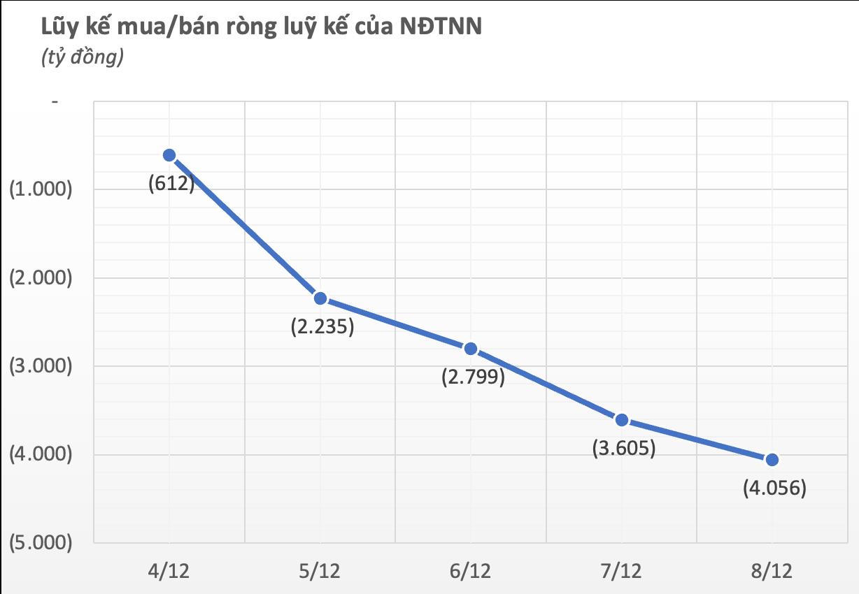 Trong bối cảnh thị trường trồi sụt mạnh, khối ngoại đang tiếp tục là điểm trừ khi bán ròng với áp lực gia tăng đột biến. Luỹ kế 5 phiên nhà đầu tư nước ngoài bán ròng 4.056 tỷ đồng trên toàn thị trường. Đây là tuần thứ 5 liên tiếp nhà đầu tư nước ngoài bán ròng trên TTCK Việt Nam. Đáng nói, riêng phiên thứ Ba 5/12 ghi nhận bán ròng đột biến hơn 1.622 tỷ đồng, mạnh nhất trong vòng gần 11 tháng (kể từ phiên 13/1).