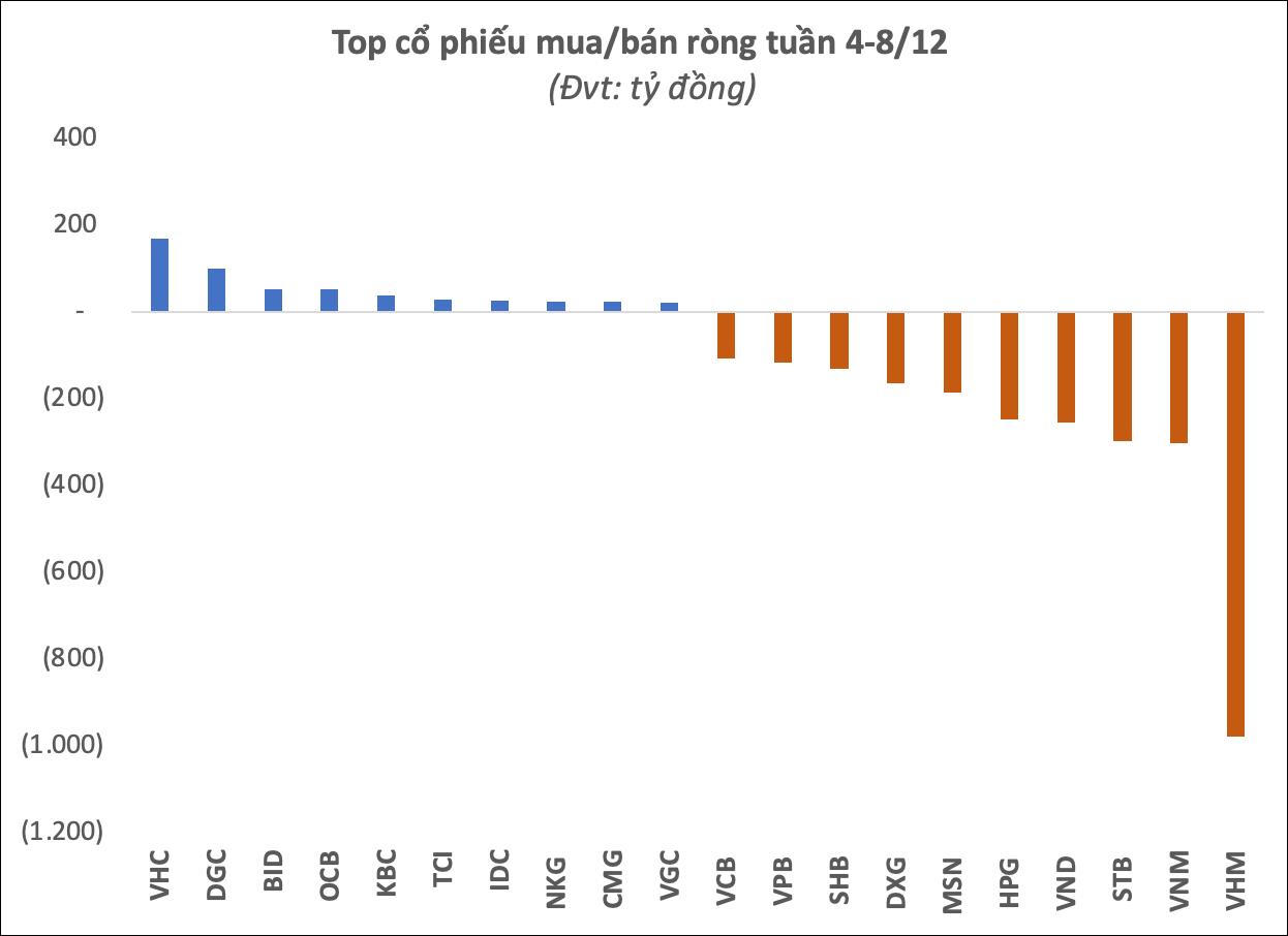 Chiều ngược lại, cổ phiếu VHC được khối ngoại mua ròng mạnh nhất với 169 tỷ đồng. Bên cạnh đó, hai cổ phiếu DGC và BID lần lượt được mua ròng 100 và 52 tỷ đồng trong 5 phiên của tuần qua. Khối ngoại cũng mua ròng mạnh tại cổ phiếu OCB và KBC với 51 tỷ đồng và 39 tỷ. Lực mua ròng trong tuần qua còn ghi nhận TCI, NKG, IDC, NKG,...