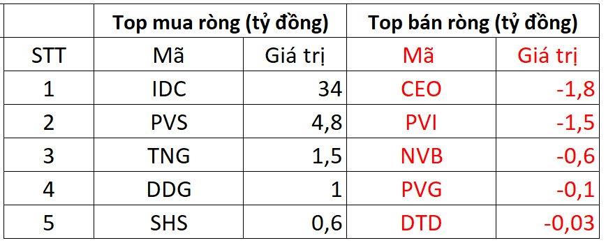 Tại chiều mua, IDC được mua ròng mạnh nhất với giá trị 34 tỷ đồng. Bên cạnh đó, PVS xếp tiếp theo danh sách mua ròng mạnh trên HNX với 4,8 tỷ đồng. Ngoài ra, khối ngoại cũng và TNG mua ròng với giá trị là 1,5 tỷ đồng.