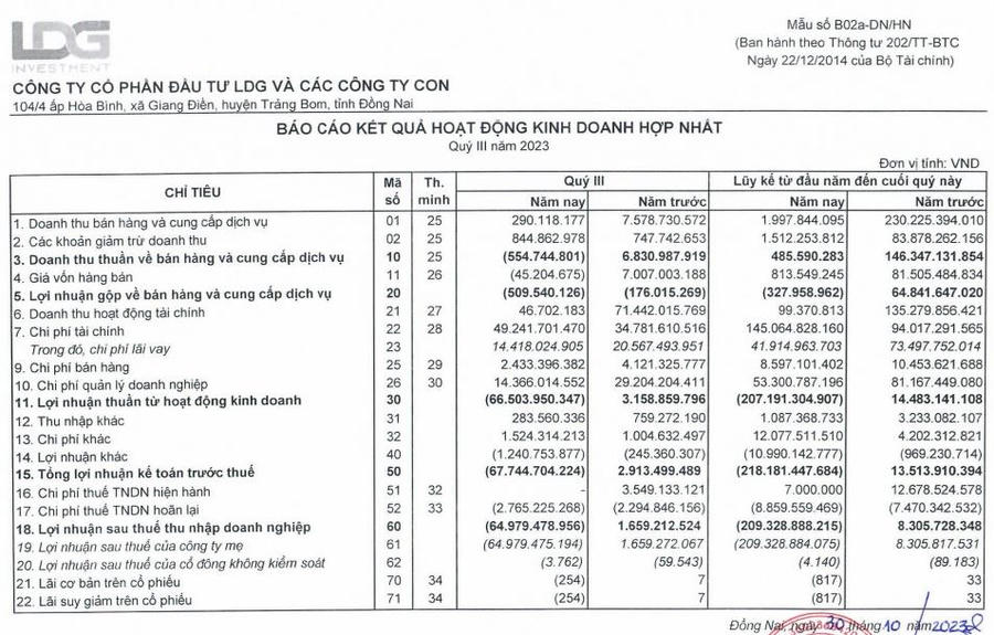 Lũy kế 9 tháng đầu năm, doanh thu thuần của LDG đạt 485 triệu đồng, trong khi cùng kỳ lãi 146,3 tỷ đồng. Công ty lỗ ròng 209,3 tỷ đồng trong khi 9 tháng đầu năm ngoái lãi 8,3 tỷ đồng.