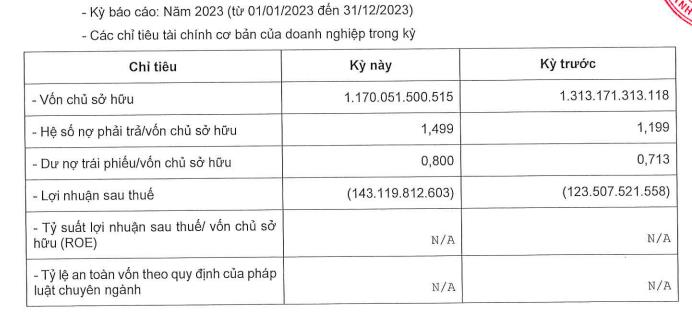 Vốn chủ sở hữu của Công ty ghi nhận 1.170 tỷ đồng, giảm so với con số 1.313 tỷ đồng hồi năm ngoái. Hệ số nợ trái phiếu trên vốn chủ sở hữu thời điểm cuối năm 2023 là 0,8, tương ứng tổng dư nợ trái phiếu khoảng 936 tỷ đồng.
