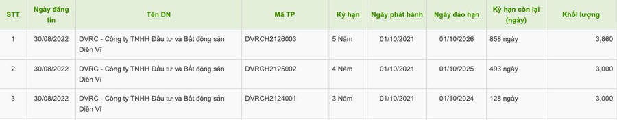 Hiện tại trên thị trường, Diên Vĩ còn lưu hành 3 lô trái phiếu được phát hành tháng 10/2021 bao gồm lô DVRCH2124001, DVRCH2125002 và DVRCH2126003.