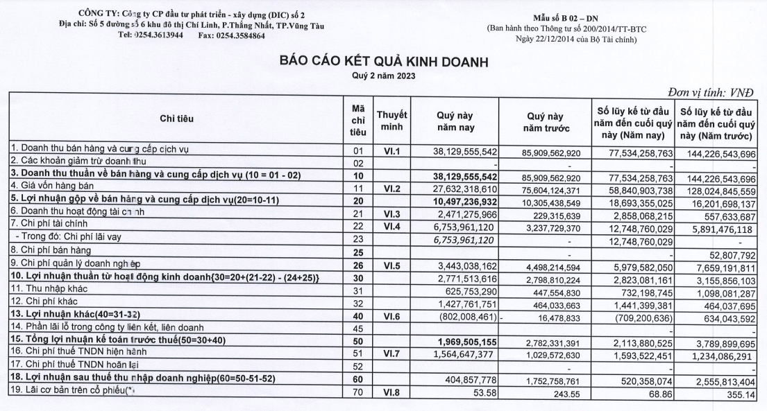 Về kết quả kinh doanh, trong quý II/2023, DC2 ghi nhận doanh thu thuần đạt 38 tỷ đồng, giảm 55% so với cùng kỳ năm ngoái.