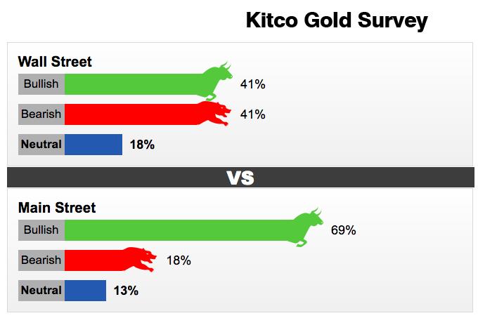 Khác với các cuộc khảo sát của Kitco về giá vàng nhiều tuần trước khi phần lớn người được hỏi nghiêng về ý kiến tăng giá, tuần này, hai luống tăng giảm lại khá cân bằng. Cụ thể, trong số 17 chuyên gia phố Wall tham gia khảo sát, có 7 chuyên gia (41%) tiên đoán giá vàng sẽ tăng cao hơn nữa. Ở chiều ngược lại, có tới 7 chuyên gia (tương đương 41%) tin tưởng giá vàng tiếp tục đi xuống, trong khi 3 chuyên gia khác (18%) dự báo vàng đi ngang.