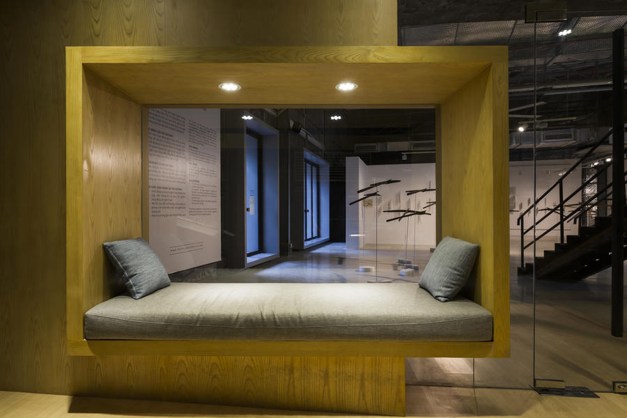 Chỗ ngồi bên cửa sổ bằng gỗ tạo điều kiện thuận lợi cho việc đọc và chiêm ngưỡng nghệ thuật xa hơn. Phía trên phòng đọc, một không gian trưng bày bằng kính được thiết kế để làm nổi bật những tác phẩm nghệ thuật đặc biệt.