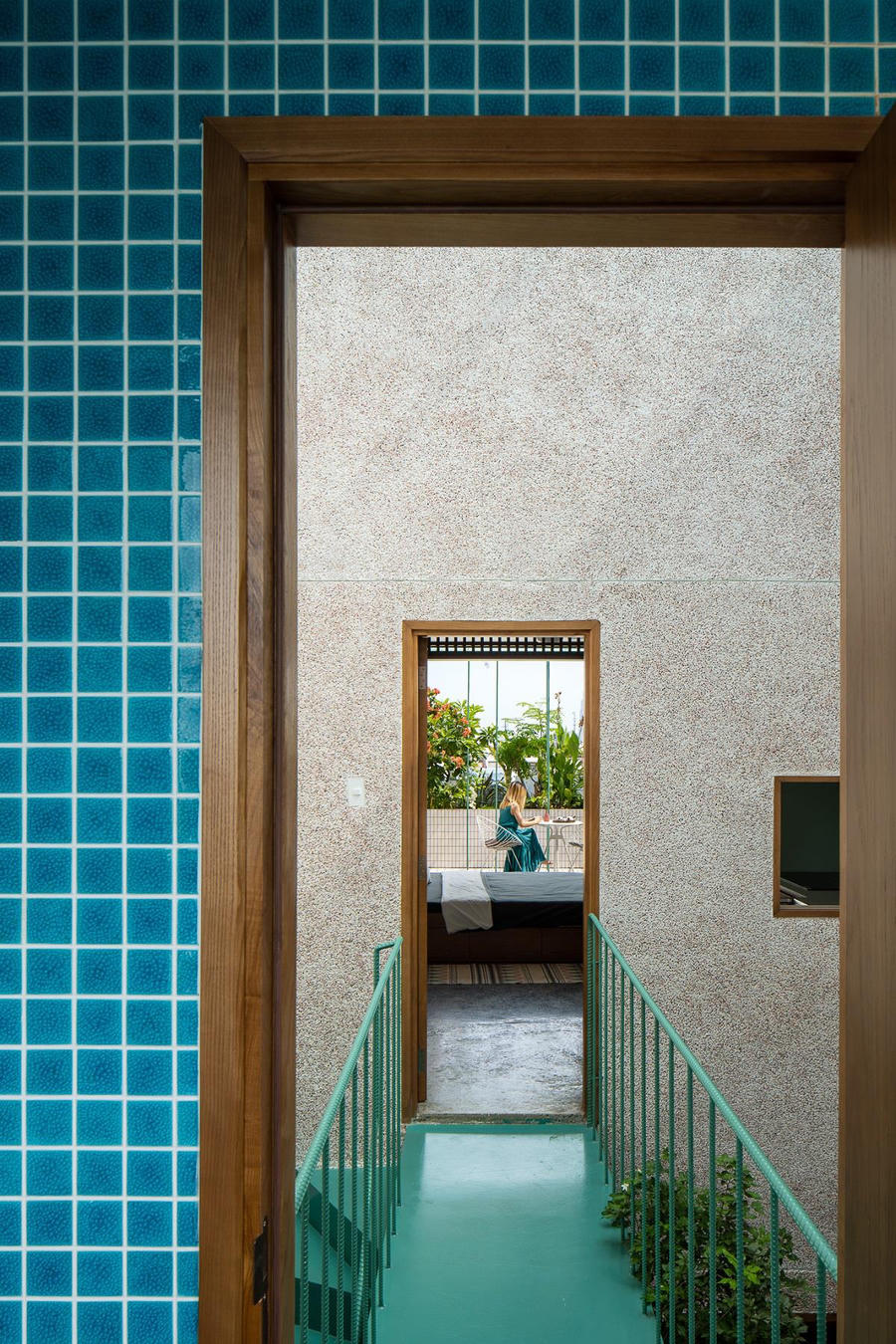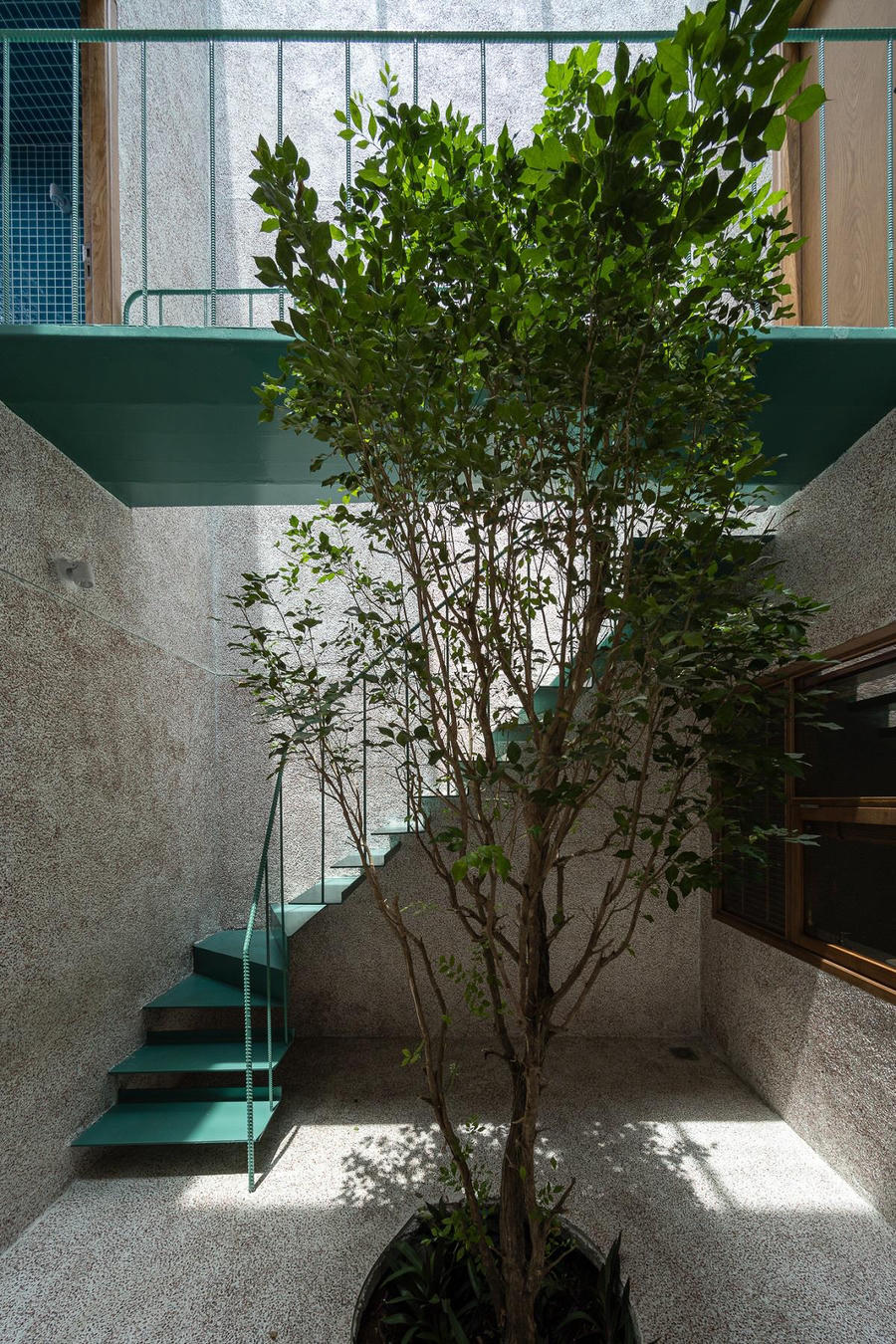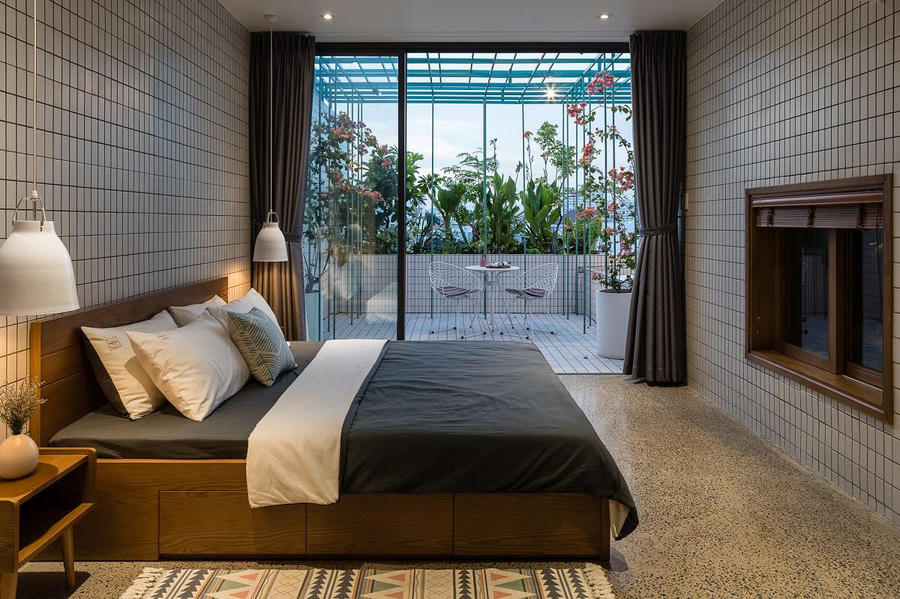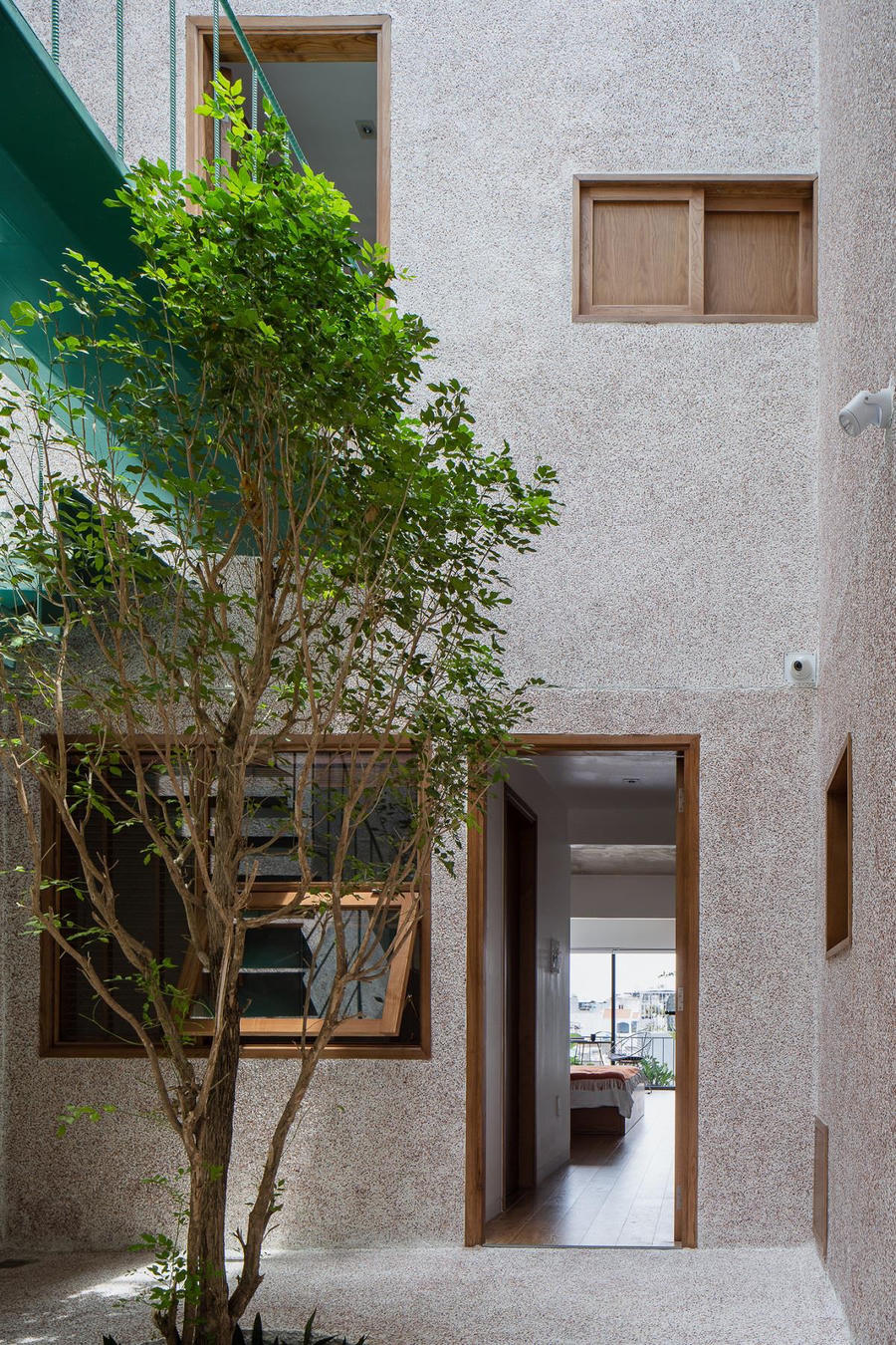 Công trình nhận nắng hướng Tây nên khu chức năng phụ trong mỗi căn hộ sẽ đẩy ra ngoài. Ngoài ra thiết kế lọc nắng cho ngôi nhà bao gồm ba lớp: ban công, cây xanh và rèm cửa.