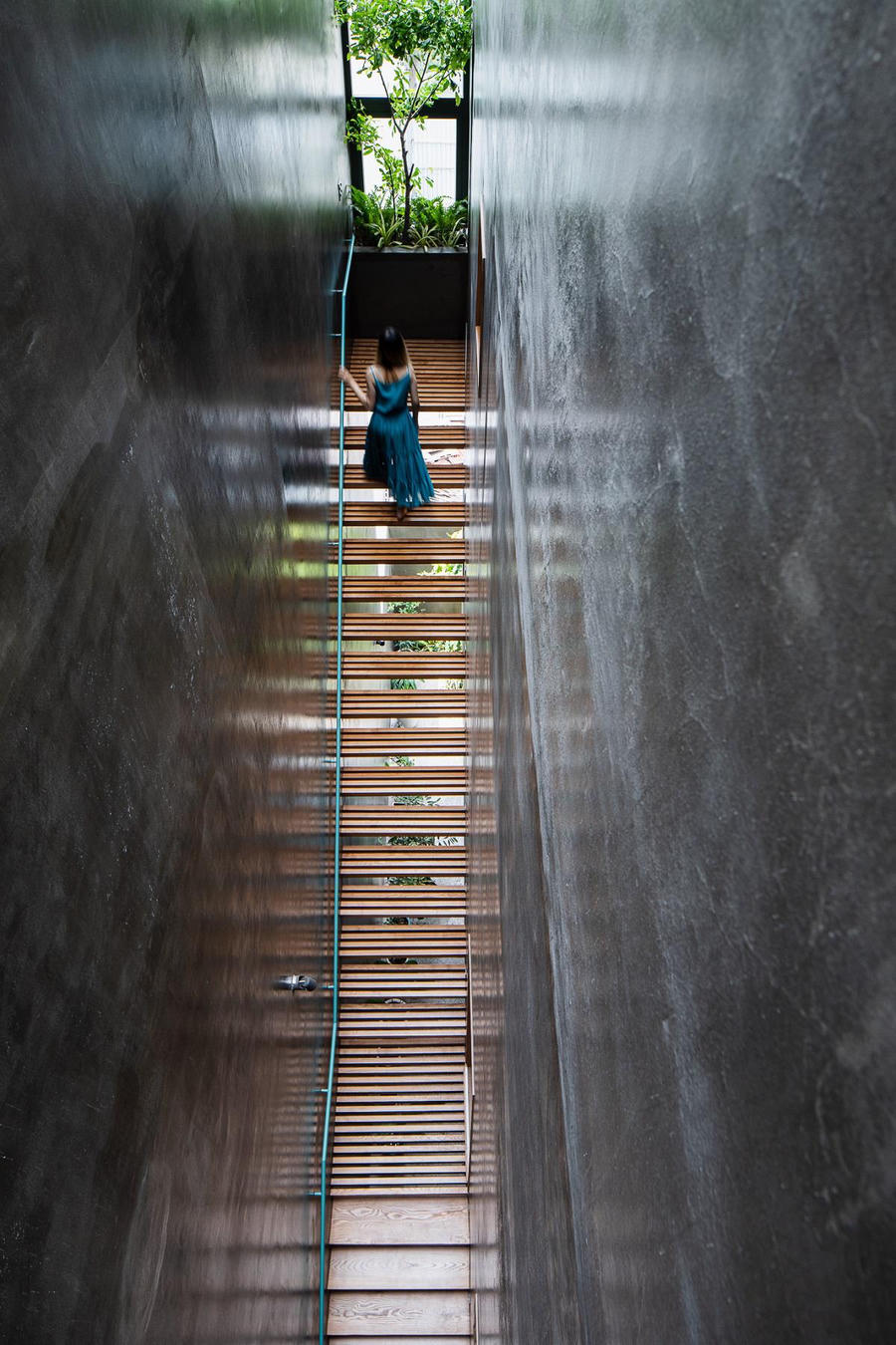 Ý tưởng thiết kế của Vy Apartment dựa theo hình ảnh ngôi nhà nằm giữa vườn. Kết cấu cầu thang lam gỗ treo được bố trí ở tầng trệt vừa là trục giao thông chính vừa thông gió cho toàn bộ không gian trong nhà.