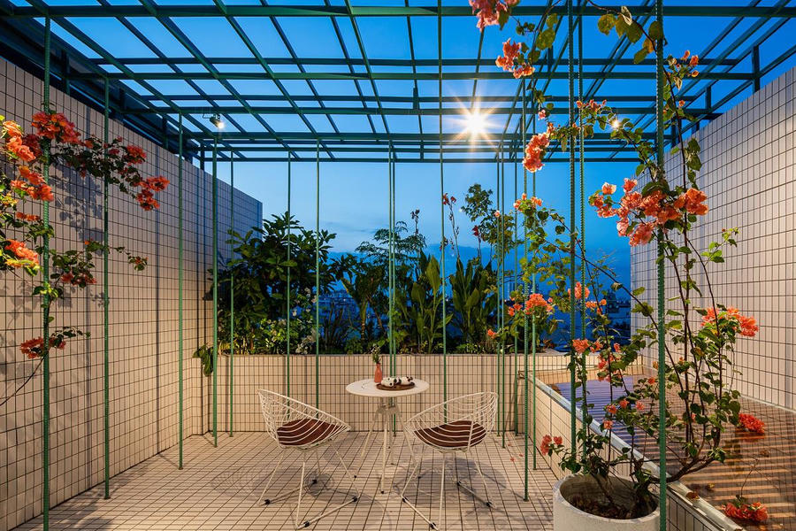 Khu vực sân thượng được ốp gạch inax trắng và bố trí nhiều cây xanh trở thành không gian thư giãn cho các thành viên trong ngôi nhà.