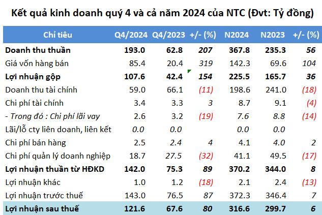 Kết quả kinh doanh quý IV tăng trưởng đã giúp NTC mang về doanh thu thuần gần 368 tỷ đồng trong năm 2024, tăng 56% so với năm trước; lãi ròng gần 317 tỷ đồng, tăng 6%.