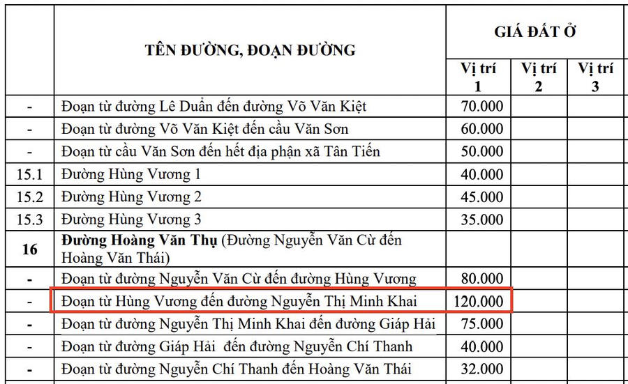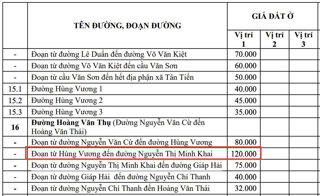Trong đó, đường Hoàng Văn Thụ tại TP. Bắc Giang (đường Nguyễn Văn Cừ đến Hoàng Văn Thái) được chia thành 5 đoạn với các mức giá khác nhau. Với đoạn từ đường Hùng Vương đến đường Nguyễn Thị Minh Khai là nơi có giá cao nhất với 120 triệu đồng/m2; đoạn thấp nhất có giá 32 triệu đồng/m2.