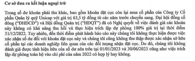 Ý kiến ngoại trừ thứ nhất là về khoản đặt cọc còn lại mua cổ phần của Công ty cổ phần Quản lý quỹ Unicap với giá trị 63,5 tỷ đồng từ năm trước chuyển sang. Kiểm toán không đánh giá được tính hiện hữu của số dư nêu trên tại 01/01/2023 và 30/06/2023 cũng như việc trích lập dự phòng toàn bộ vào chi phí của năm 2022 có hợp lý hay không.