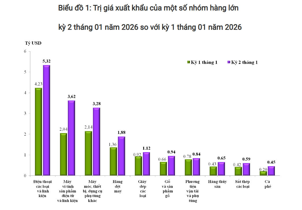 Trong kỳ 2 tháng 1/2026, tổng trị giá hàng hóa xuất khẩu của Việt Nam đạt 25,08 tỷ USD, tăng 38,9% (tương ứng tăng 7,03 tỷ USD) so với kỳ trước. Mức tăng chủ yếu đến từ nhiều nhóm hàng xuất khẩu chủ lực. Cụ thể, điện thoại các loại và linh kiện tăng 1,58 tỷ USD (tăng 77,1%); máy móc, thiết bị, dụng cụ và phụ tùng khác tăng 1,13 tỷ USD; máy vi tính, sản phẩm điện tử và linh kiện tăng 1,09 tỷ USD (tăng 25,9%); hàng dệt may tăng 520 triệu USD (tăng 38,2%); gỗ và sản phẩm gỗ tăng 284 triệu USD (tăng 43,2%) so với kỳ trước.