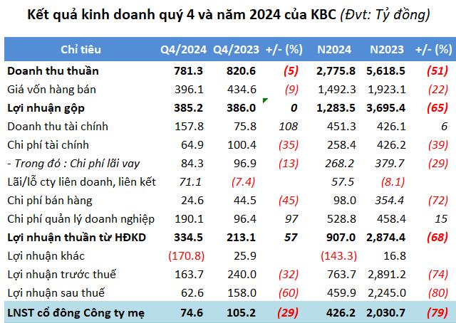 Trong quý cuối cùng của năm, KBC ghi nhận doanh thu thuần hơn 781 tỷ đồng, giảm 5% so với cùng kỳ; trong khi doanh thu tài chính gần 158 tỷ đồng, tăng 108%. Bên cạnh đó, KBC lãi hơn 71 tỷ đồng từ công ty liên doanh, liên kết (cùng kỳ lỗ hơn 7 tỷ đồng).