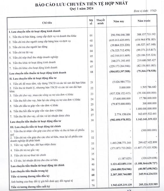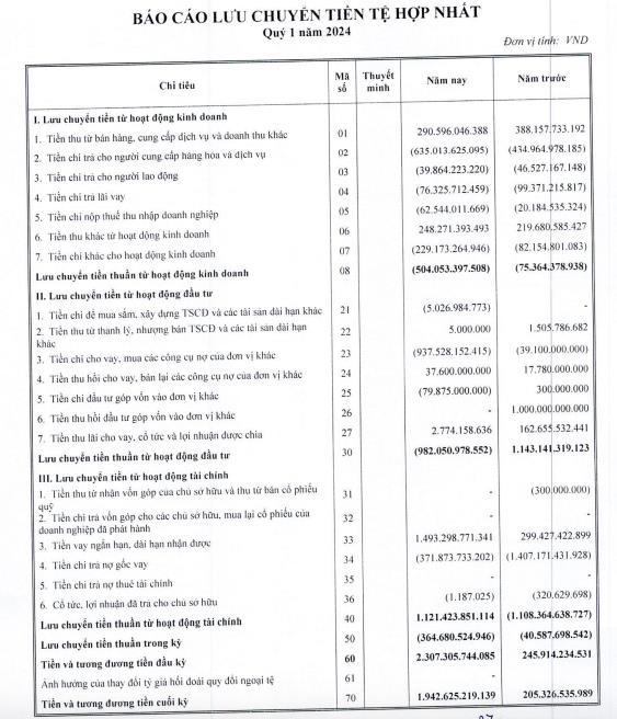 Ngoài ra, dòng tiền hoạt động đầu tư âm 982,05 tỷ đồng và dòng tiền tài chính dương 1.121,4 tỷ đồng, chủ yếu tăng vay nợ để bù đắp thâm hụt dòng tiền kinh doanh.