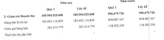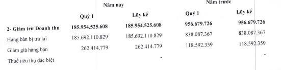 Tuy vậy, trong quý đầu năm 2024, mặc dù doanh thu ghi nhận 186,44 tỷ đồng nhưng hàng bán trả lại lên tới 185,6 tỷ đồng.