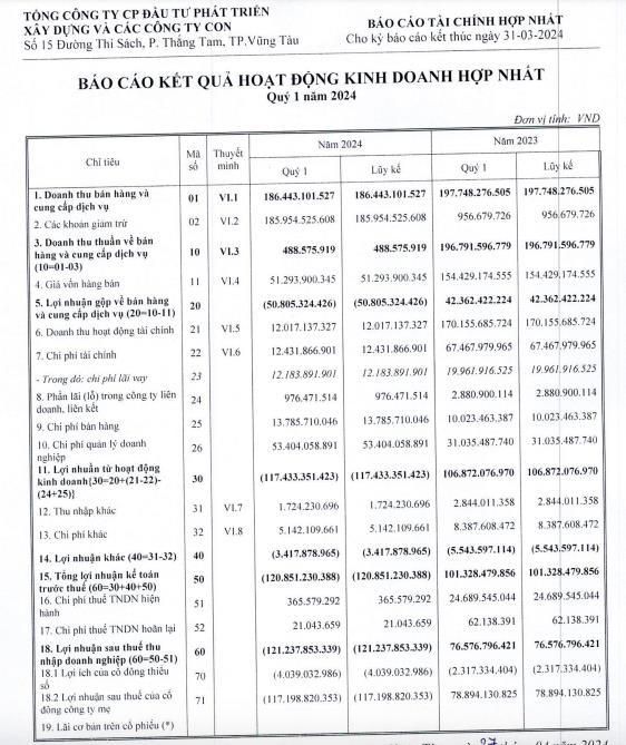 Theo báo cáo tài chính hợp nhất quý I/2024 của Công ty cổ phần Đầu tư Phát triển Xây dựng (DIC Corp, mã ck: DIG), trong 3 tháng đầu năm, Công ty ghi nhận doanh thu thuần đạt 488,5 triệu đồng, thấp hơn rất nhiều so với con số 197 tỷ đồng đạt được ở cùng kỳ năm ngoái.