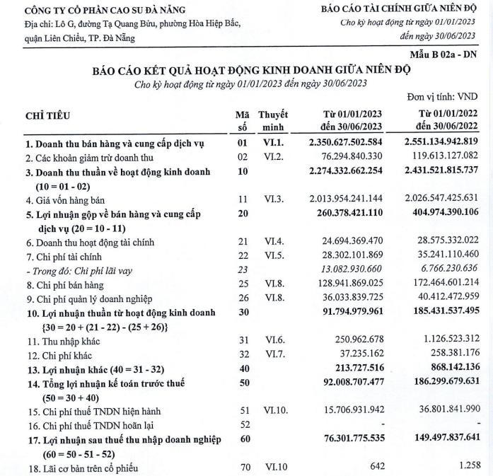 Kết thúc nửa đầu năm 2023, với lợi nhuận đạt 76,32 tỷ đồng, Cao su Đà Nẵng mới hoàn thành 28,9% kế hoạch lợi nhuận năm.