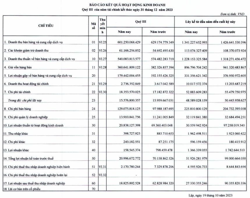 Công ty cho biết do ảnh hưởng khó khăn chung từ nền kinh tế thế giới và nền kinh tế trong nước dẫn đến chi phí bán hàng và các chi phí khác tăng hơn so cùng kỳ, đây là yếu tố làm giảm lợi nhuận.