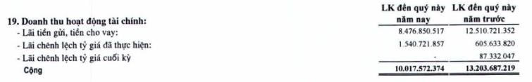 Doanh thu hoạt động tài chính giảm 24,2% về 10 tỷ đồng, trong đó chủ yếu là lãi tiền gửi, tiền cho vay, giảm 32,8% về 8,4 tỷ đồng. Lãi chênh lệch tỷ giá cuối kỳ không ghi nhận trong khi cùng kỳ năm ngoái đạt 87,3 triệu đồng.