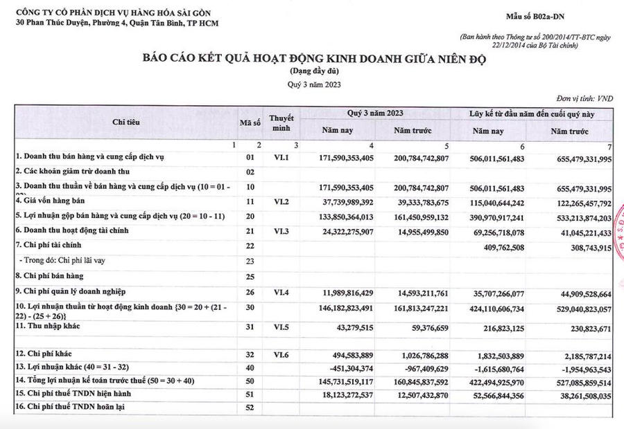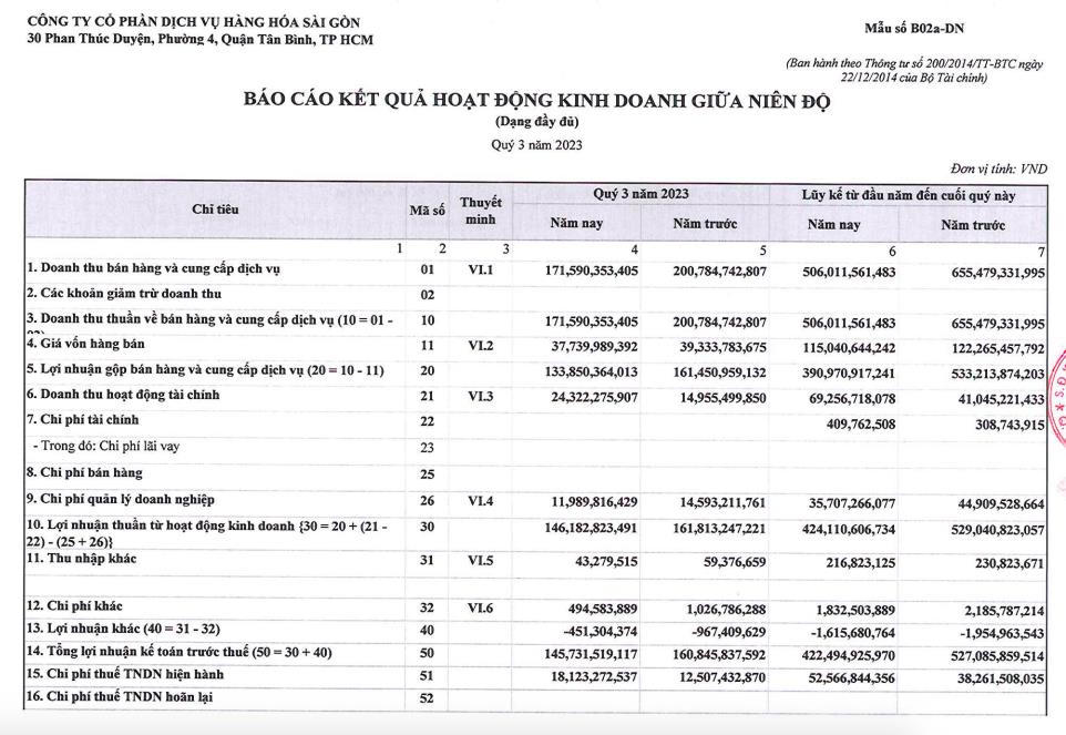 Lũy kế 9 tháng, SCS đạt 506 tỷ đồng doanh thu, giảm 23% so với cùng kỳ. Lợi nhuận sau thuế ghi nhận 370 tỷ đồng, giảm 24% so với cùng kỳ năm 2022.
