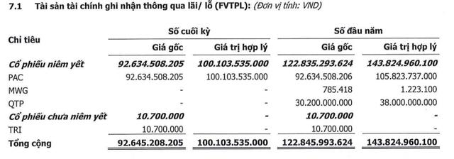 Tại thời điểm 30/9/2022, quy mô tự doanh của TCI đạt khoảng 100 tỷ đồng, giảm gần 44 tỷ đồng so với thời điểm đầu năm (tính theo giá trị hợp lý). Danh mục cổ phiếu tự doanh hiện chỉ còn cổ phiếu PAC với giá gốc gần 93 tỷ đồng (lãi khoảng 7 tỷ đồng), các khoản đầu tư tại MWG và QTP từ đầu năm đã không còn hiện hữu.