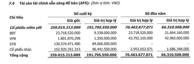 Trong khi đó, danh mục tài sản tài chính sẵn sàng để bán (AFS) hiện đang lỗ khoảng 67 tỷ đồng, tương ứng hiệu suất -26%. Cụ thể, danh mục gồm có BBT, VPB, STB với tổng giá trị đầu tư ban đầu là hơn 155 tỷ đồng. Tính đến cuối quý 3, TCSC đang tạm ghi lỗ 46 tỷ đồng với STB và 14 tỷ đồng với BBT.