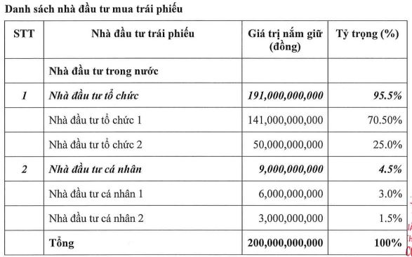Về cơ cấu phát hành, trong 200 tỷ đồng huy động, nhà đầu tư tổ chức đứng ra mua 95.5% (tương đương 191 tỷ đồng), còn lại là nhà đầu tư cá nhân chuyên nghiệp (4.5%).