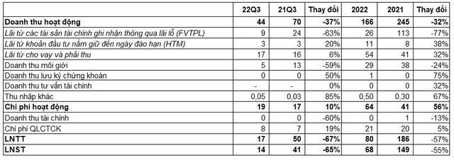 Theo giải trình từ phía công ty, lợi nhuận sau thuế sụt giảm so với cùng kỳ nguyên nhân chủ yếu do sự sụt giảm chung của thị trường, theo đó chỉ số VN-Index giảm 24,4% so với cuối năm 2021. Điều này đã tác động rõ rệt đến các nguồn thu chính của công ty, cụ thể từ doanh thu tự doanh và hoạt động môi giới giảm rõ rệt.