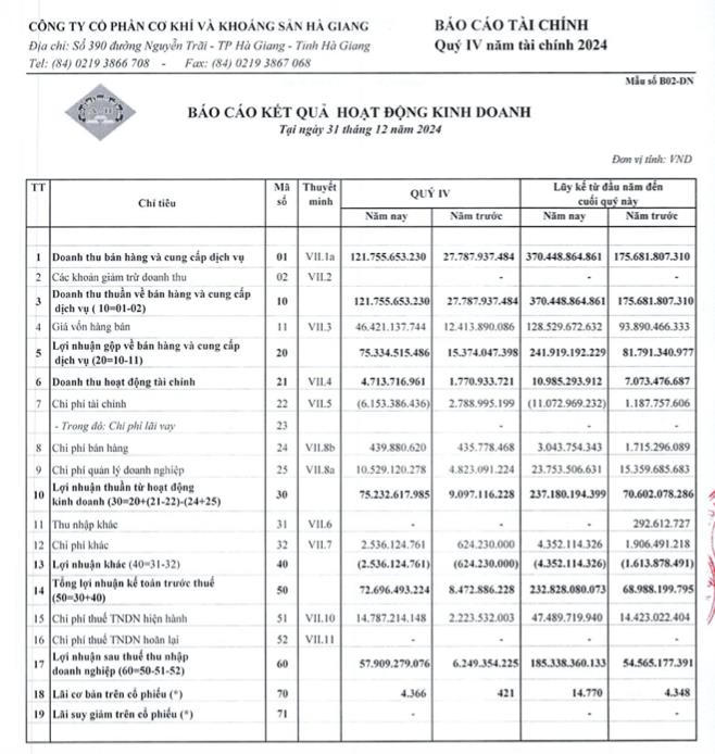 Về bức tranh tài chính, trong quý IV/2024, HGM ghi nhận doanh thu thuần đạt 121,7 tỷ đồng, tăng gấp 4,3 lần so với cùng kỳ năm ngoái. Giá vốn hàng bán tăng gấp gần 4 lần, kéo lợi nhuận gộp tăng gần 5 lần so với quý IV/2023.