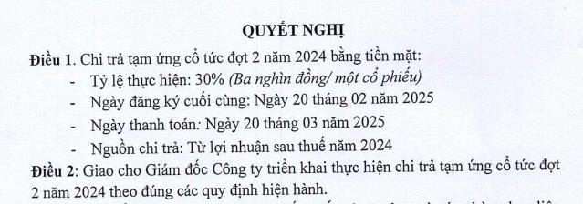Trước đó, Công ty đã tạm ứng cổ tức đợt 1/2024 theo tỷ lệ 20% (tương đương 2.000 đồng/cổ phiếu).