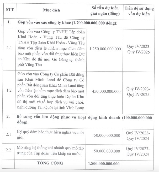 Với 1.800 tỷ đồng dự kiến thu được, công ty sẽ sử dụng 1.250 tỷ đồng góp vốn vào Công ty TNHH Tập đoàn Khải Hoàn - Vũng Tàu để tăng vốn điều lệ, mục đích đảm bảo một phần vốn thực hiện dự án Khu đô thị mới Gò Găng - TP Vũng Tàu.
