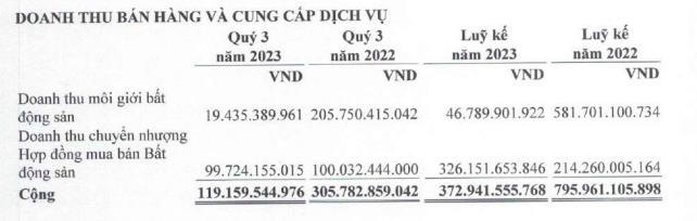 Về cơ cấu doanh thu, chiếm chủ yếu là doanh thu môi giới bất động sản, giảm tới 91%, chỉ đạt 19 tỷ đồng; doanh thu chuyển nhượng hợp đồng mua bán bất động sản gần như không thay đổi so với cùng kỳ.