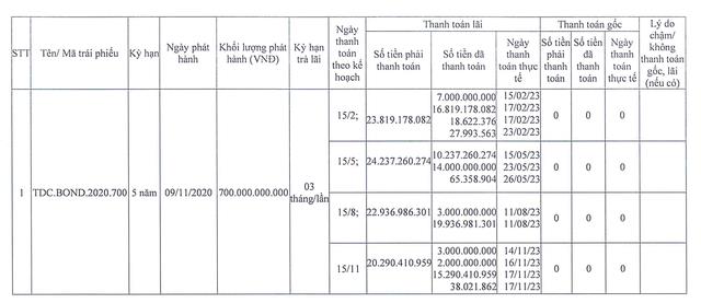 Được biết, đây là lô trái phiếu mã TDC.BOND.2020.700 được phát hành ngày 9/11/2020, kỳ hạn 5 năm (đáo hạn ngày 9/11/2025), mệnh giá 700 tỷ đồng và trả lãi 3 tháng/lần. Trong đó, lãi suất trái phiếu là 10,5%/năm cho 4 kỳ tính lãi đầu tiên; lãi suất 11%/năm cho kỳ lãi từ 5 đến 8; và sau đó là lãi suất theo biên độ nhưng không thấp hơn 11,5%/năm và đơn vị lưu ký lô trái phiếu là CTCP Chứng khoán Navibank.