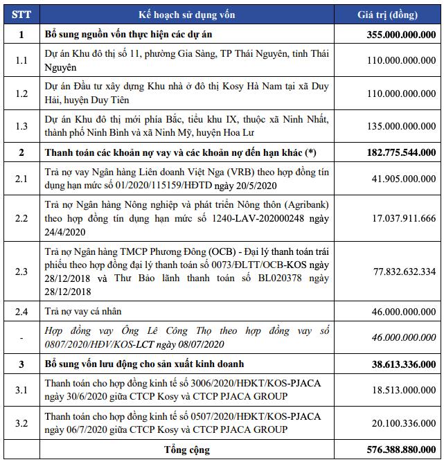Gần 183 tỷ đồng sẽ dùng để thanh toán các khoản nợ vay, nợ đến hạn các ngân hàng: Phương Đông (hơn 77 tỷ đồng), Liên doanh Việt Nga (gần 42 tỷ đồng), Agribank (17 tỷ đồng). Số tiền 39 tỷ đồng còn lại sẽ được bổ sung vào vốn lưu động để thanh toán hai hợp đồng giữa Kosy và Công ty cổ phần Pjica Group.